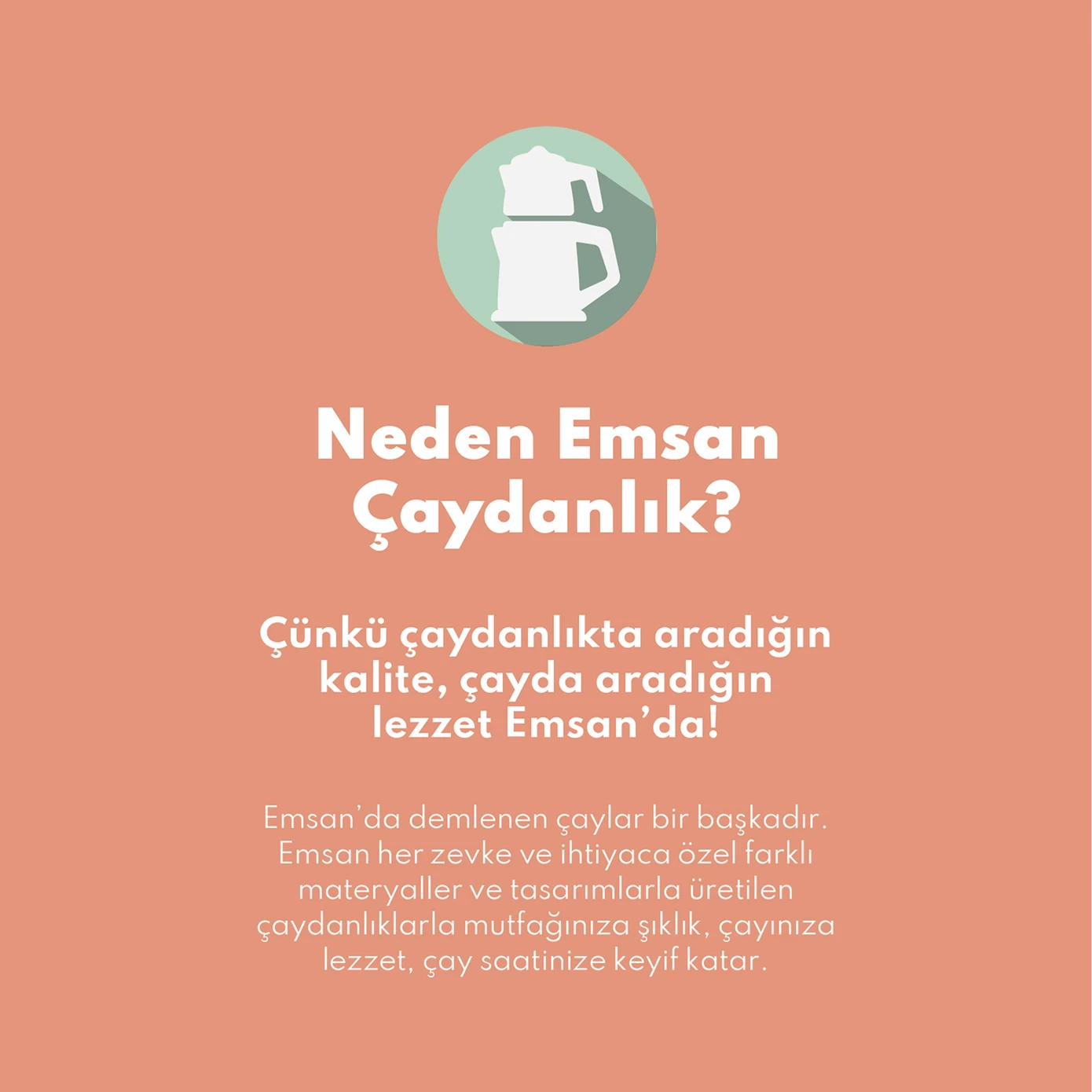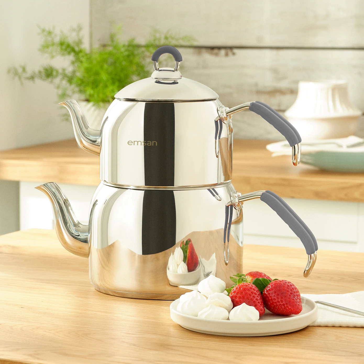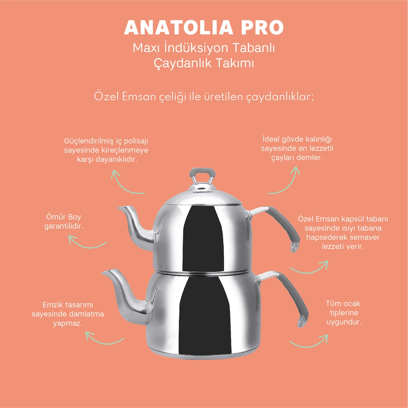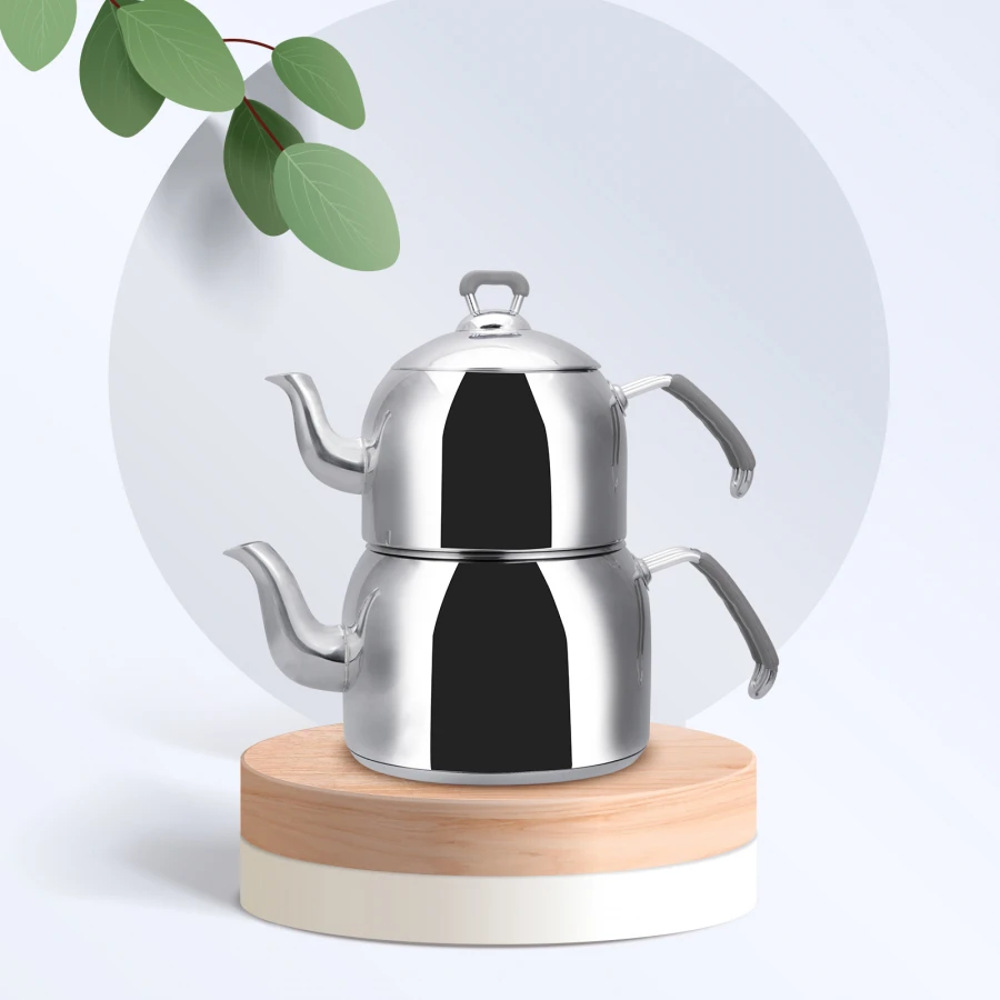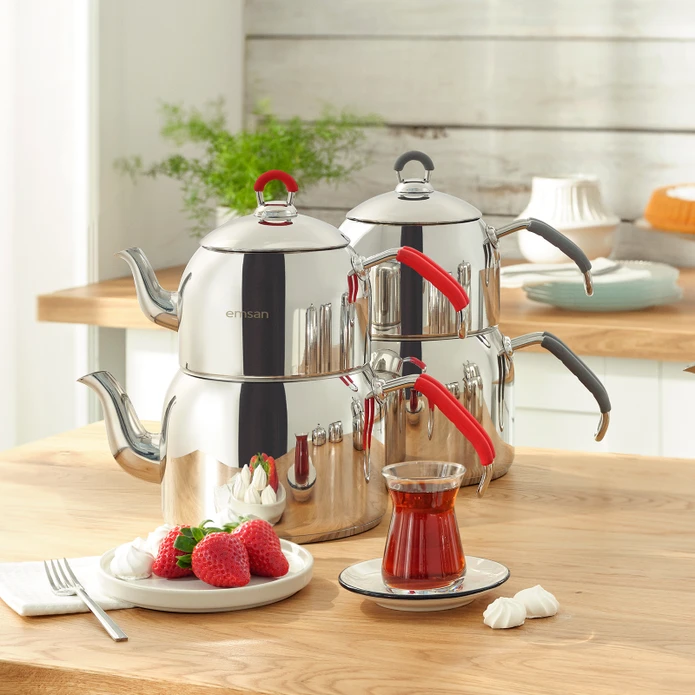 Geniş hacimli ve şık tasarımlı Emsan Anatolia Paslanmaz Çelik Çaydanlık.