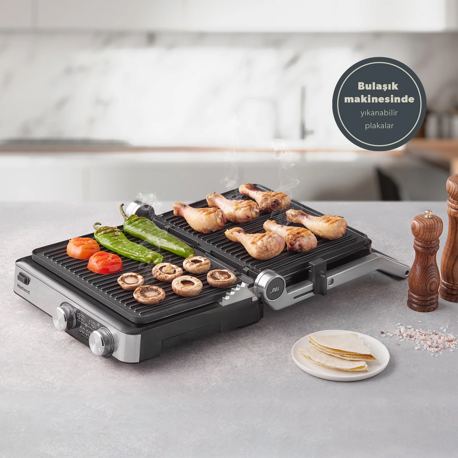 Bir tost makinesinin ızgara yapabilmesi pek ilginç değil. Peki, ayrı ayrı ısıtılabilen plakalarla aynı anda iki farklı ızgara yapmak. İşte bu ilginç olabilir. Homend Grilliant Tost ve Izgara Makinesi aynı anda 4 kişilik tost pişirmeyi sağlayan geniş kapasitesi ile tüm aile ve arkadaşlarınıza yeter. 180 derece açılabilen plakalarını ayrı ayrı ısıtarak bir tarafta ızgarada et yaparken diğer tarafta da düşük ısıda sebze ızgara yapabilirsiniz. Üstelik LED ekranında sıcaklık derecesini görebilir ve ısıyı istediğiniz gibi ayarlayabilirsiniz. Ayrıca zaman ayarı sayesinde siz ne zaman isterseniz, yiyeceğiniz o zaman hazır olur. Grilliant’ın yağ kanalları etin yağını ortada biriktirir, biriken yağlar yağ kabına damlar. Bu sayede ızgaradan sonra yağ temizliğiyle uğraşmazsınız, kenarlarda çıkıntı olmadığı için de elinizi yakmazsınız. Çıkarılabilen plakaları bulaşık makinesinde yıkanabilir. Böylelikle çıkarıp makinede yıkayabilir, yıkandıktan sonra takıp pırıl pırıl kullanabilirsiniz.