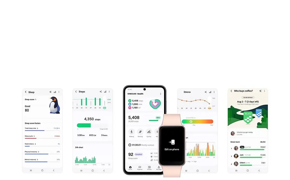 GALAXY FİT3 İLE GÜNLÜK AKTİVİTELERDEN KANDAKİ OKSİJEN SEVİYELERİNE KADAR SAĞLIK DENEYİMİNİZİ HER GÜN TAKİP EDİN. DURUMUNUZU DEĞERLENDİRİN VE DAHA SAĞLIKLI SEÇİMLER YAPIN.Sağlık ve fitness durumunuzu tek bakışta görün Telefonunuzdaki Samsung Health uygulamasıyla antrenman performansınızı, kişisel ilerlemenizi, uyku alışkanlıklarınızı ve daha fazlasını kapsamlı bir şekilde görün. Galaxy Fit3 cihazınızdan toplanan verilerinize bakın ve daha büyük bir ekranda daha uzun bir süre boyunca görüntüleyin.