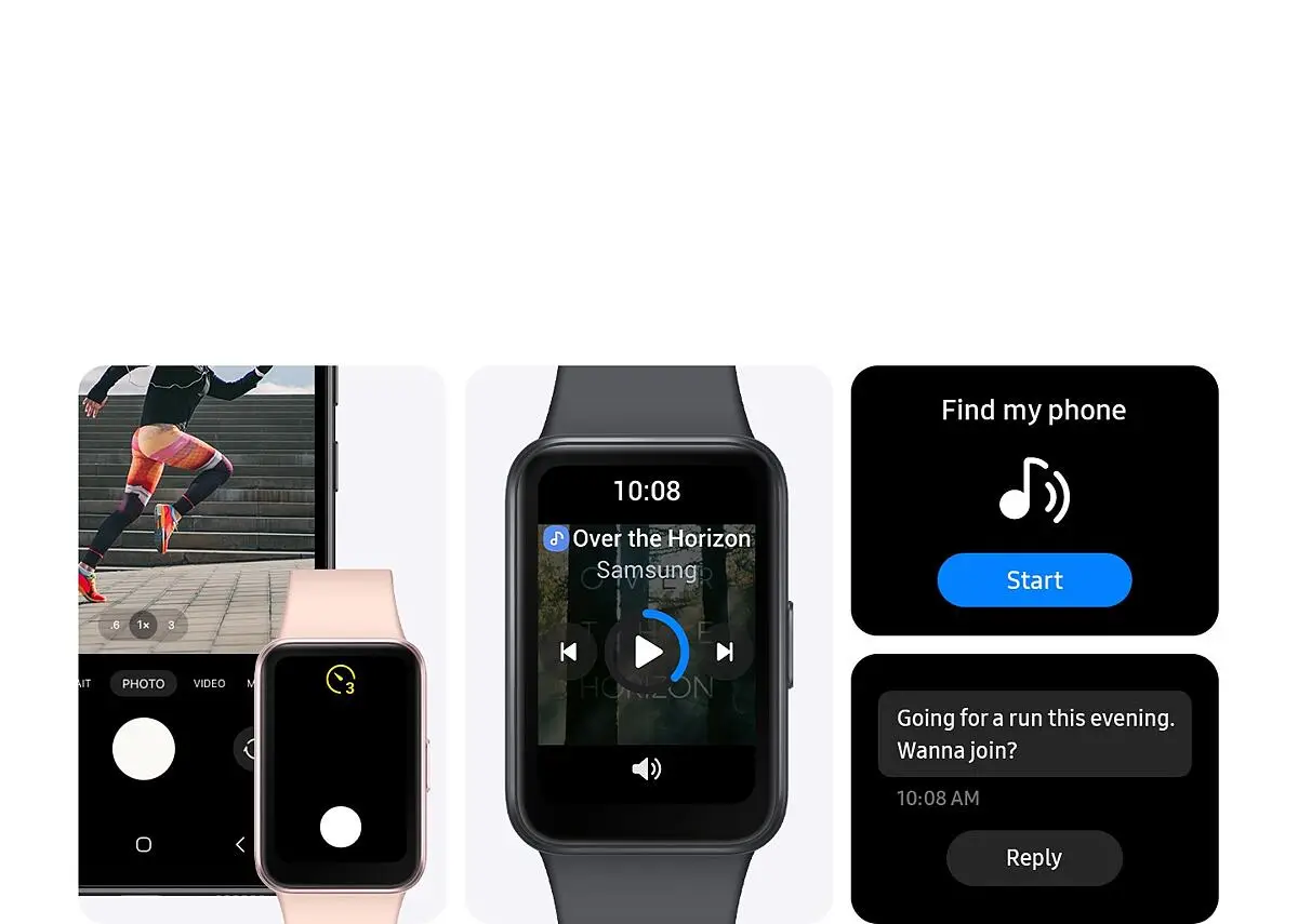 Fotoğraf çekin, müzik oynatın, gelen aramaları kontrol edin ve kısa mesajla yanıt verin. Tüm bunları Galaxy akıllı telefonunuzla senkronize ettiğiniz saatinizle bileğinizden yapın. Telefonunuz mu kayıp? Galaxy Fit3 cihazınızdan telefonunuzu çaldırmasını ve onu bulmanıza yardımcı olmasını isteyin. Üstelik favori ayarlarınızı korumak için saat kadranlarınızı, uygulamalarınızı ve daha fazlasını yedekleyebilirsiniz.